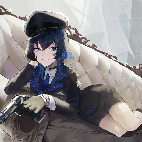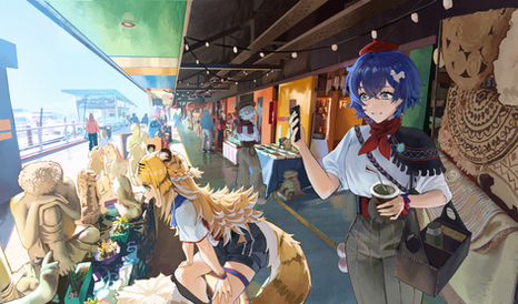 A complete illustration of a character with lineart, colour, full rendering and a simple background with few elements.